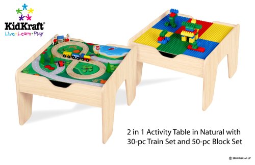 The play table comes with two in one toys for play value, it's a train table on one side and Snapping Duplo blocks on the other side. This is a great space saving toy for your child's room because it comes with storage space under the playing board. The table is in Natural finish and it comes with a 30 piece train set and a 50 piece snapping block set.